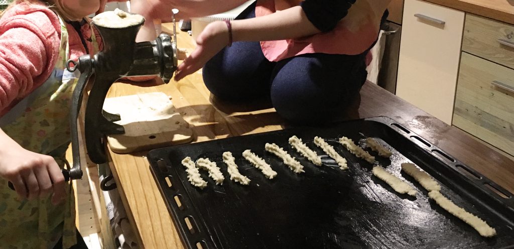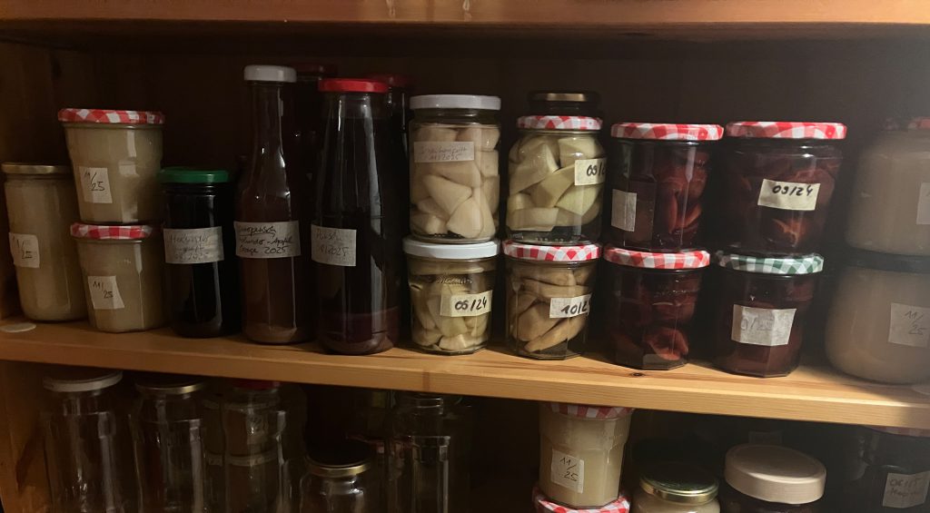 Im Keller war ein vier Meter langes Regal mit drei Ebenen voll gefüllt mit eingekochten Erbsen, Möhren und Bohnen. Daneben standen die großen Gläser mit Kompott von Erdbeeren, Stachelbeeren, Kirschen, Birnen und Pflaumen. Auf der oberen Ebene standen die Marmeladengläser, die akurat mit Zelluphanpapier zugebunden waren. In großen Steintöpfen waren Gurken eingelegt und im Garten standen Grünkohl, Porree und Rosenkohl. Auf dem Boden hingen die Bohnenbüsche zum Trocknen, die für eine „dicke Suppe” gut waren. Dann waren noch die vielen Kisten im Keller mit den Winteräpfeln.