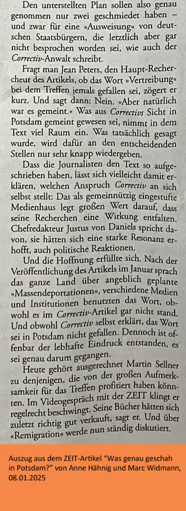 Ich habe mich jetzt sehr gefreut, dass die ZEIT Journalisten Anne Hähnig und Marc Widmann sich die Hintergründe des Berichts und die Formulierungen noch einmal genau angesehen und mit 10 Teilnehmern des damaligen Treffens und den Correctiv-Reporter Jean Peters und dem Chefredakteur Justus von Daniels gesprochen haben.